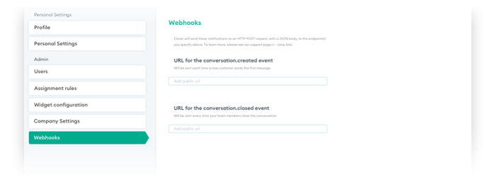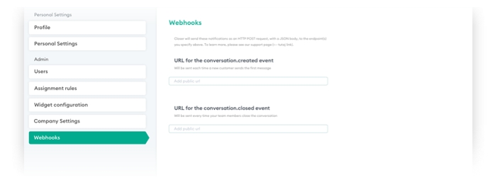 You can send information from Closer to your application via Webhooks. If you're new to webhooks, read this guide to learn more.