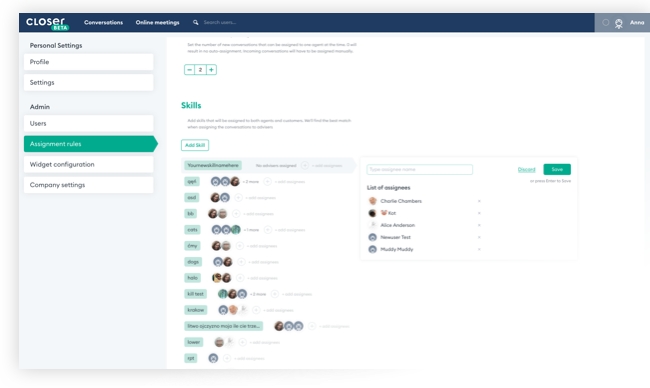 Skills are used in conjunction with customer routing tags. When tag is matched with skill, routing is directed to that person(s). Add skills of your team in the Admin / Assignment rules section. Advisers can have multiple skills.